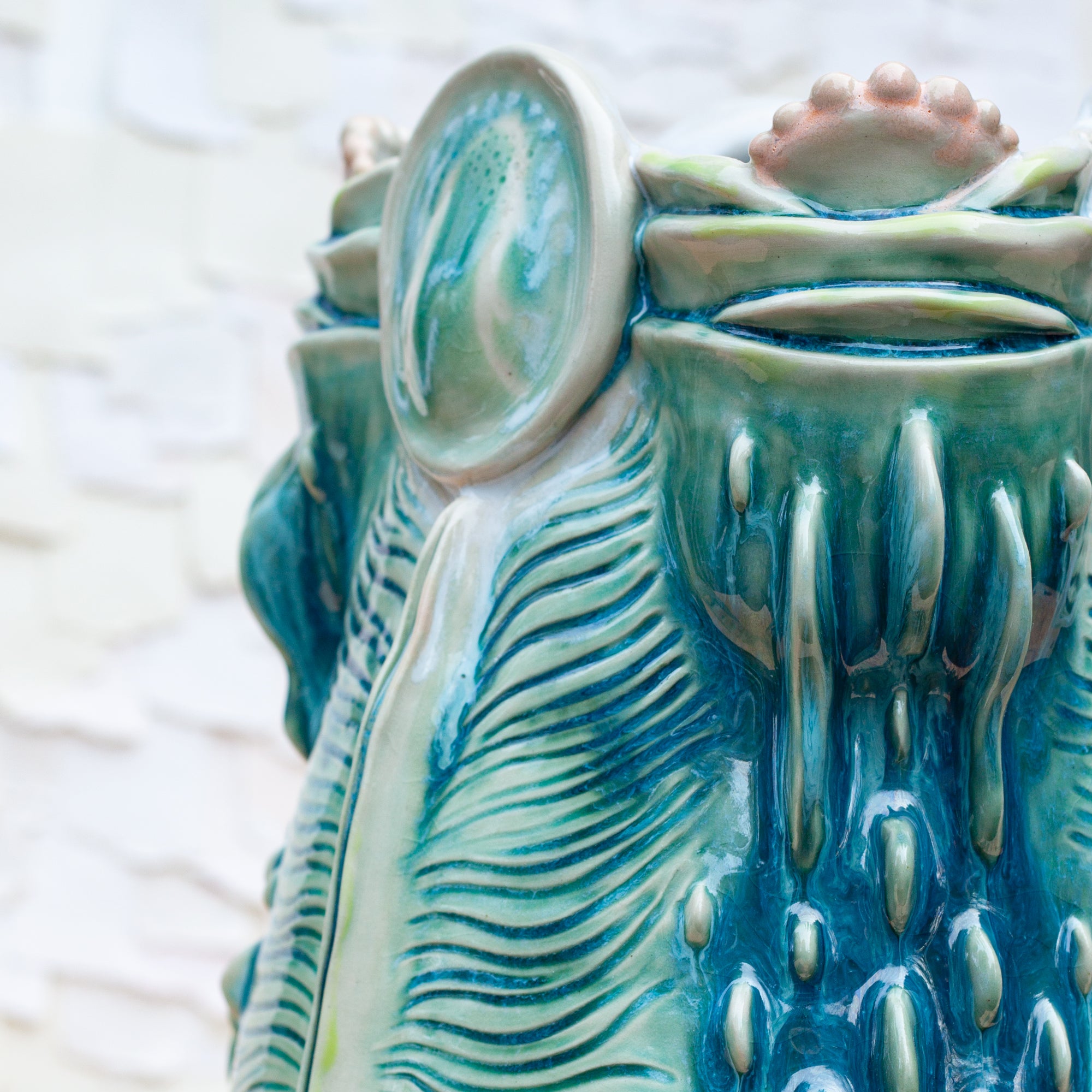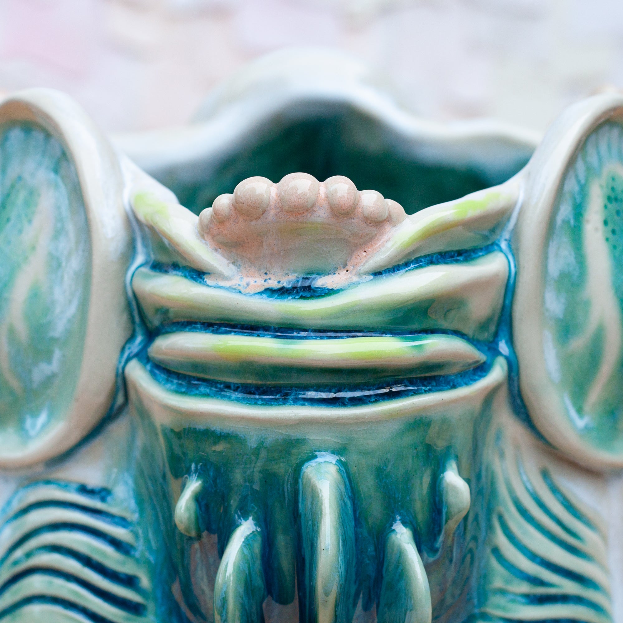 This large statement piece holds court over the other objects in the room. Wheel thrown to start, then handbuilt and altered, sculpted details adorn with forms pulled form plant growth patterns, tidal life, art nouveau, and Jenn's churning imagination. Glaze has been layered and flows in my favorite tones from this past season.