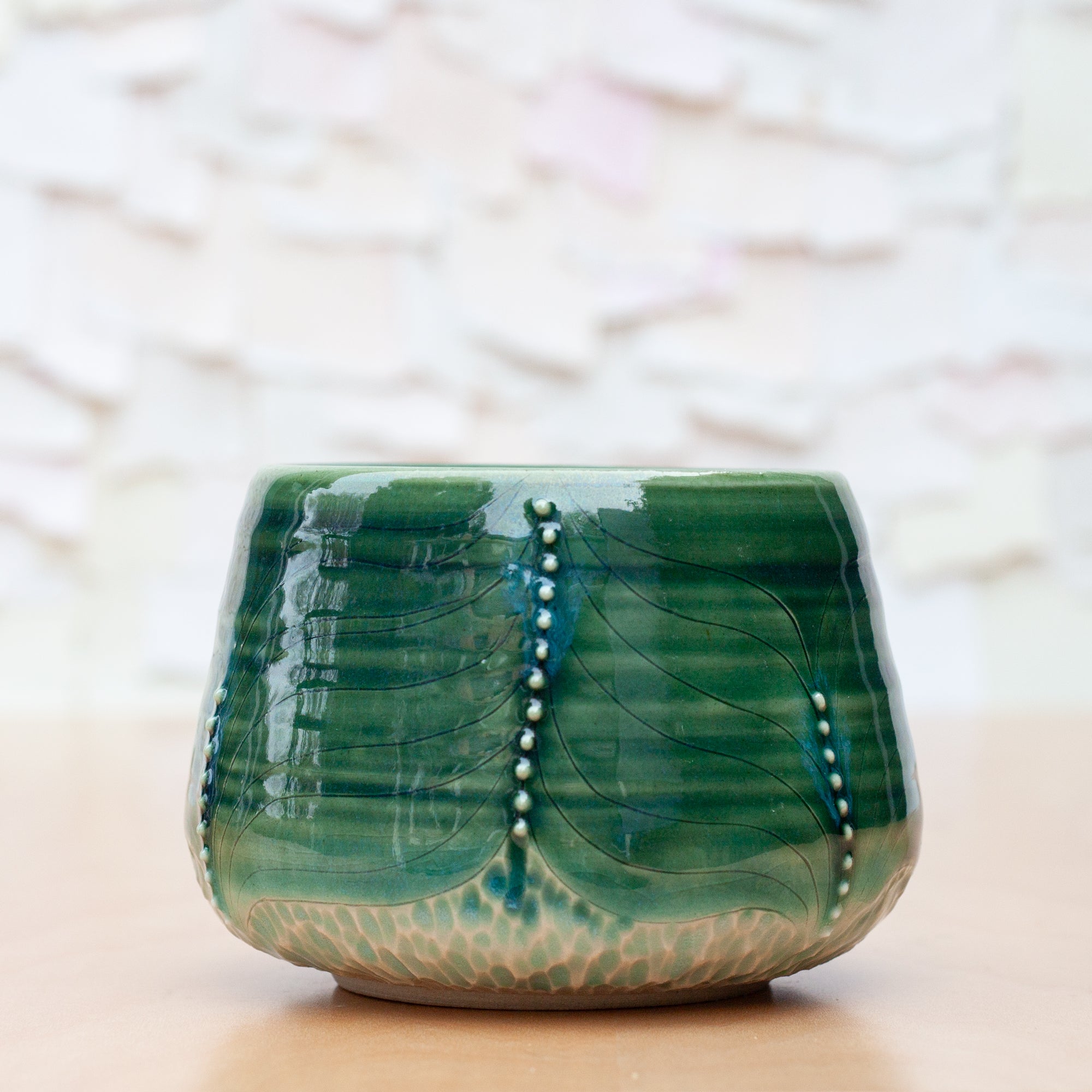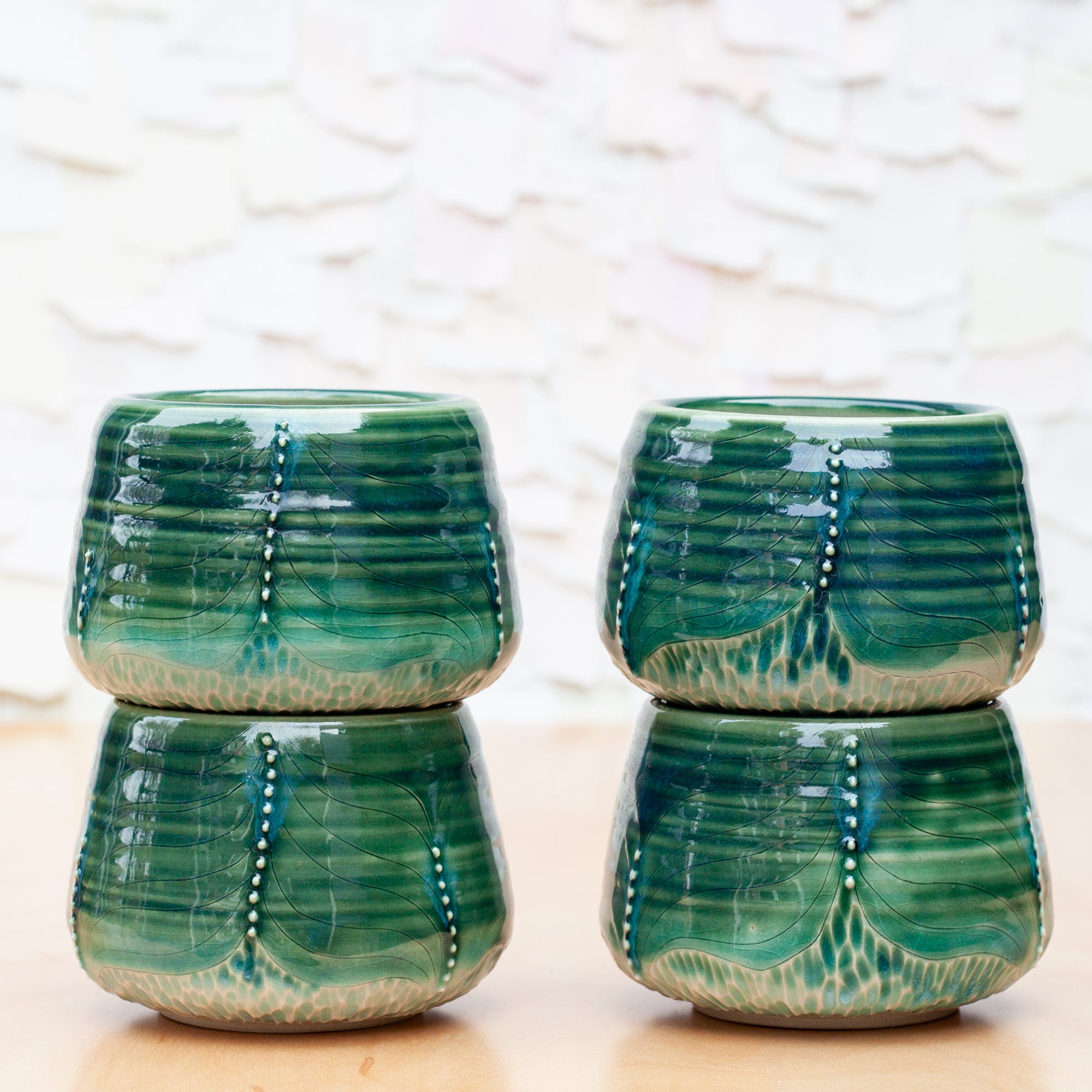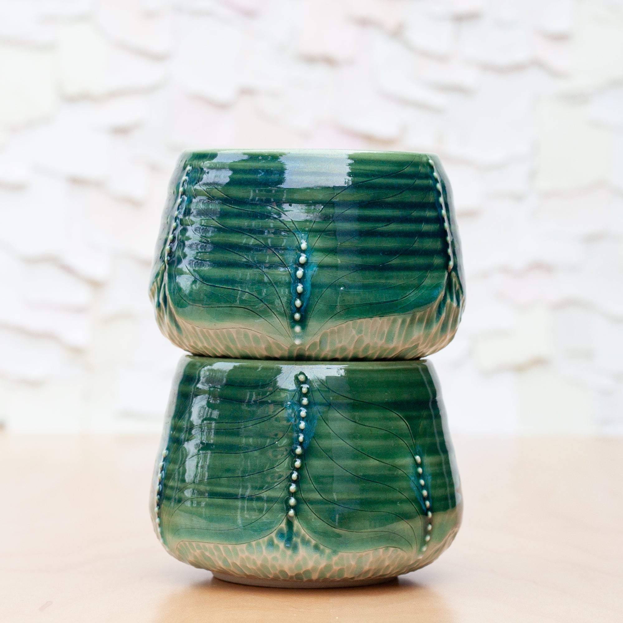 A sweet little tumbler hand drawn and slip trailed in a flowing pattern inspired from hydroids in the sea and cactus surfaces. Enjoy with wine, a mocktail, or your beverage of choice! These stack nicely!