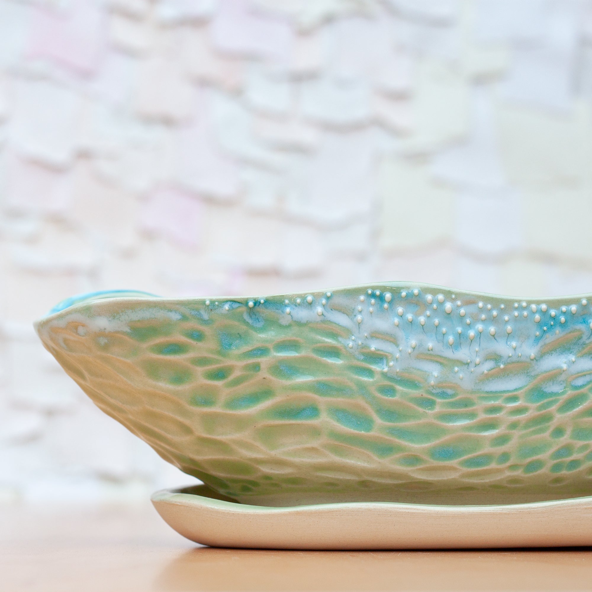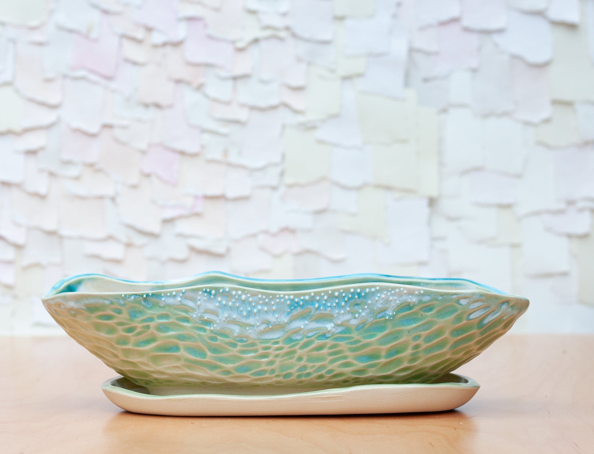 The most magical part of the coast is of course, the ever changing, ever moving sea. It is easy to get lost in it's meditative rhythm. This planter's pattern is inspired from those movements. Glazed in a mix of my favorite blue shades.