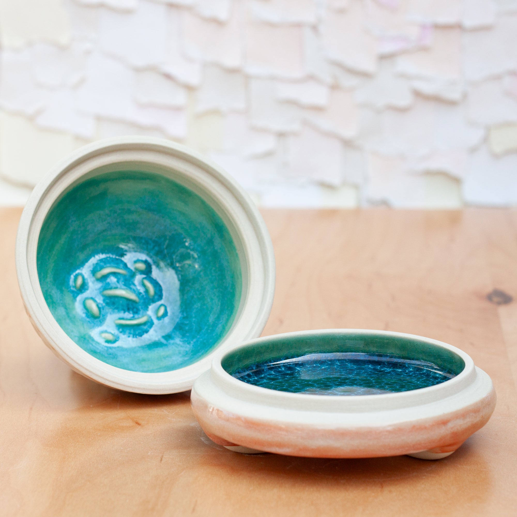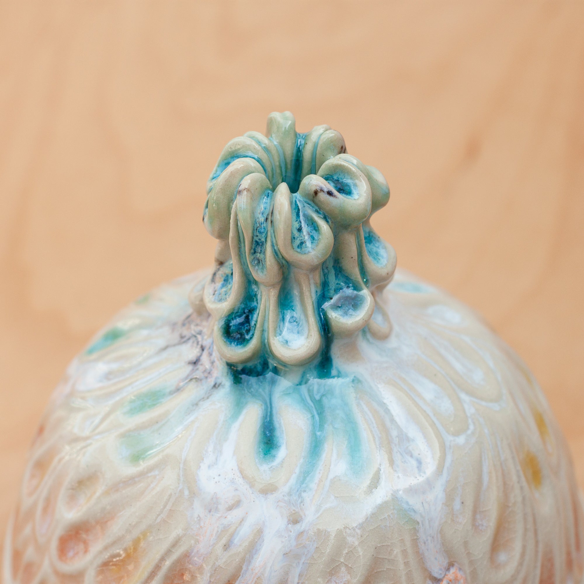 This lidded piece has been hand thrown and altered, carved, and sculpted. The beautiful thoughtfully carved, cascading knob allows glaze to pool and run down the side of the dome. The sides have been carved in a beautiful relief that swirls around the sides, concluding with the knob. Glazed in a prism of color.
