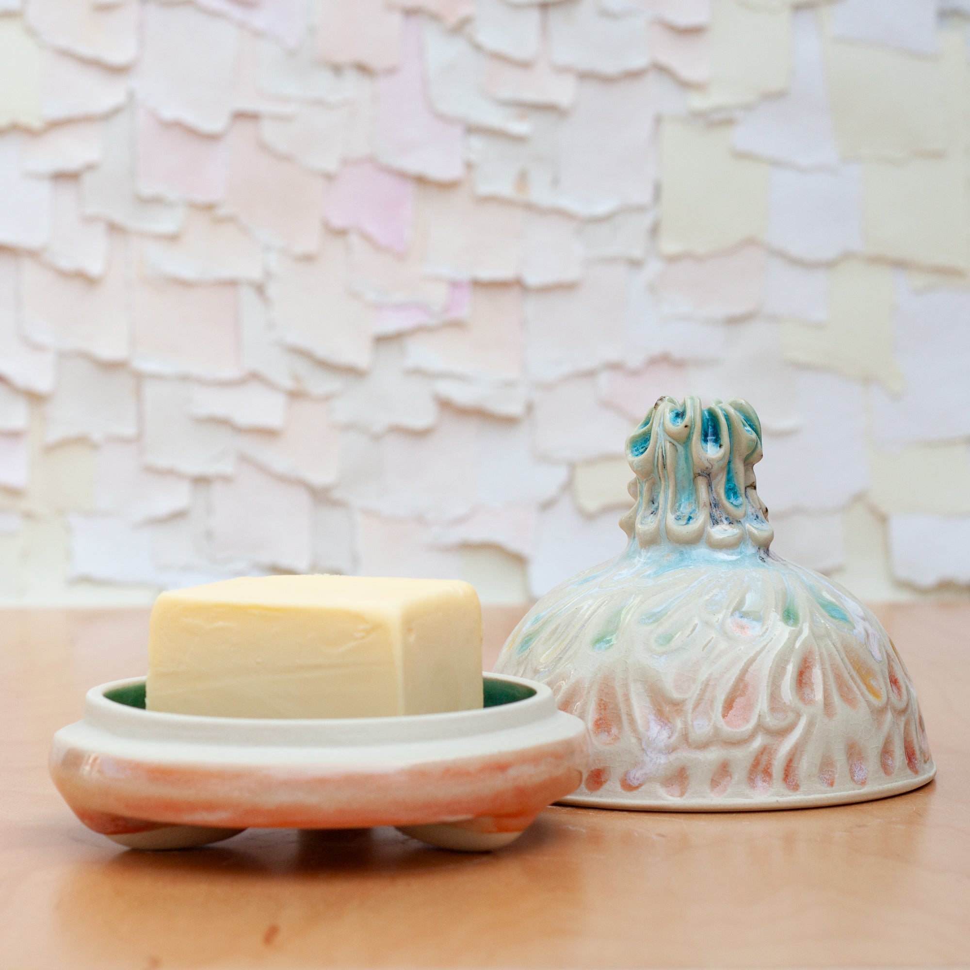 This beautiful butter dome is sure to be a focal point on your table. With a generous well to hold a butter stick cut half side by side or a perfect half kerrygold stick, the raised lip keeps the lid.