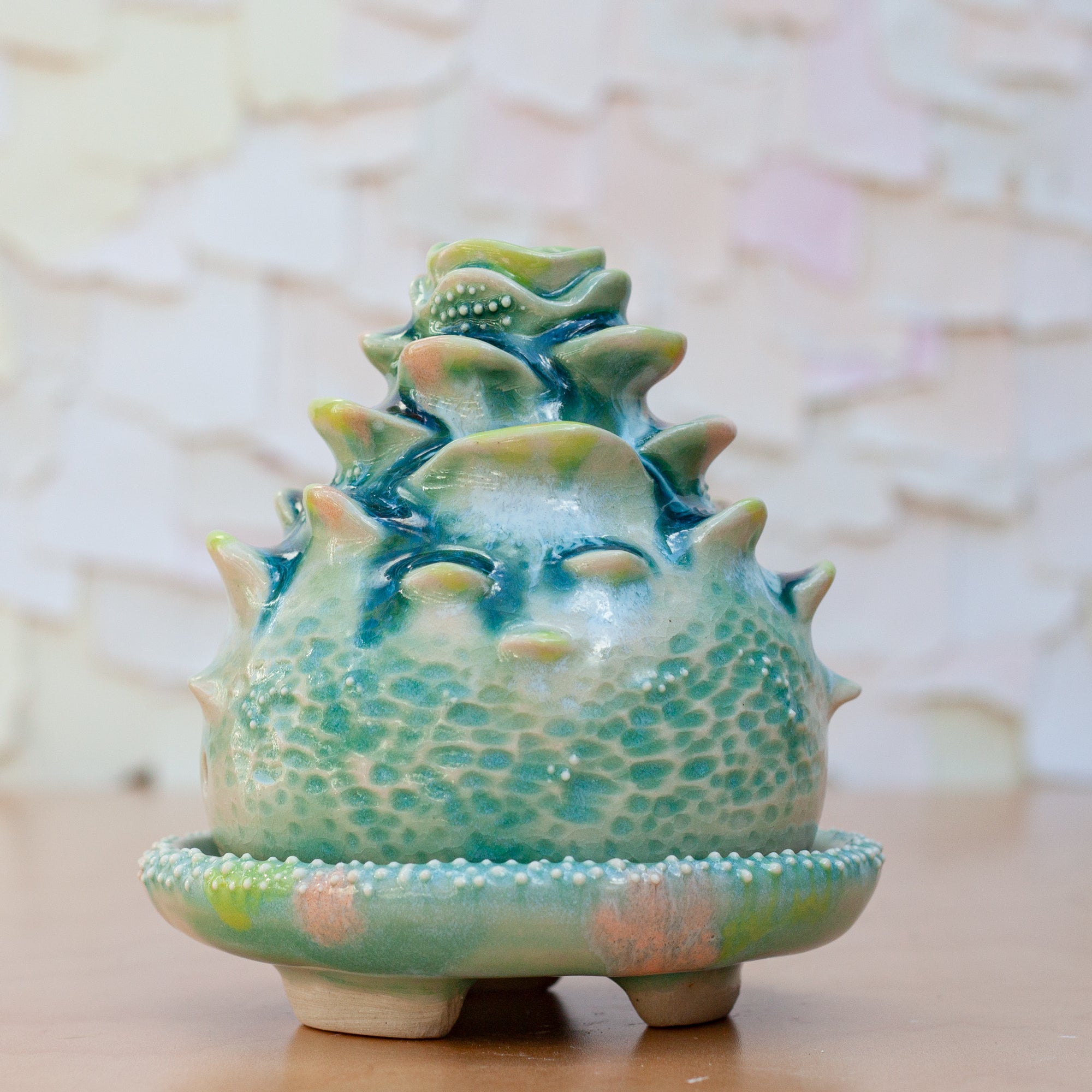 This lidded piece has been hand thrown and altered, carved, and sculpted. The beautiful succulent inspired sculpted detail grows up to the top where the incense smoke releases. Glazed in beautiful brilliant glaze.