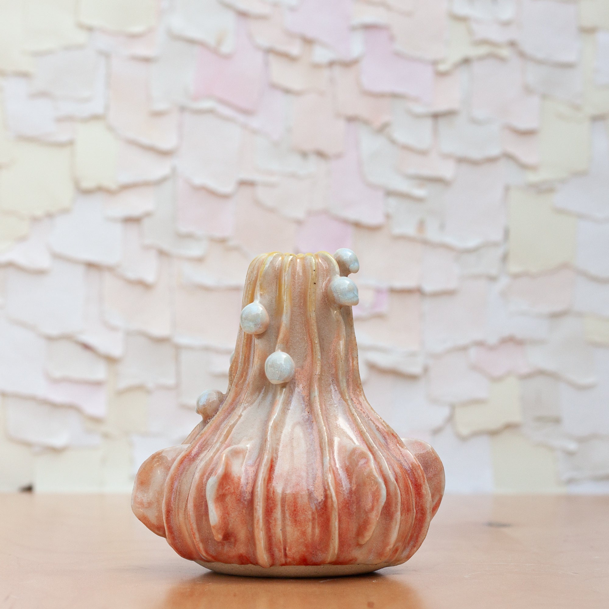 This stunning piece is a combination of many techniques. Thrown on the wheel, altered and the fins was then added, layer by layer. A porcelain slip brushed on allows for the glaze and the little "pearls" to glow.