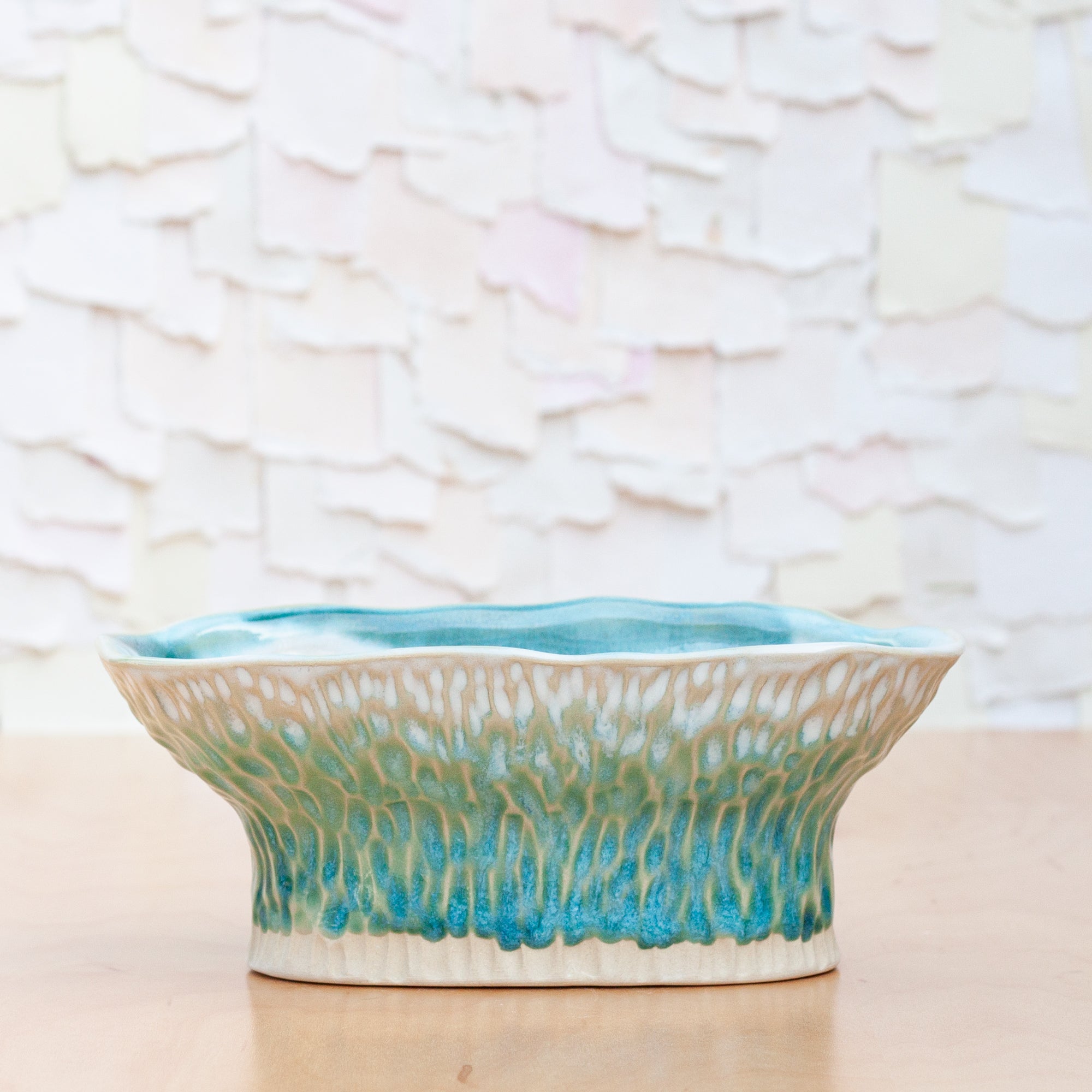Beautiful carved texture flows down the sides. Handbuilt.