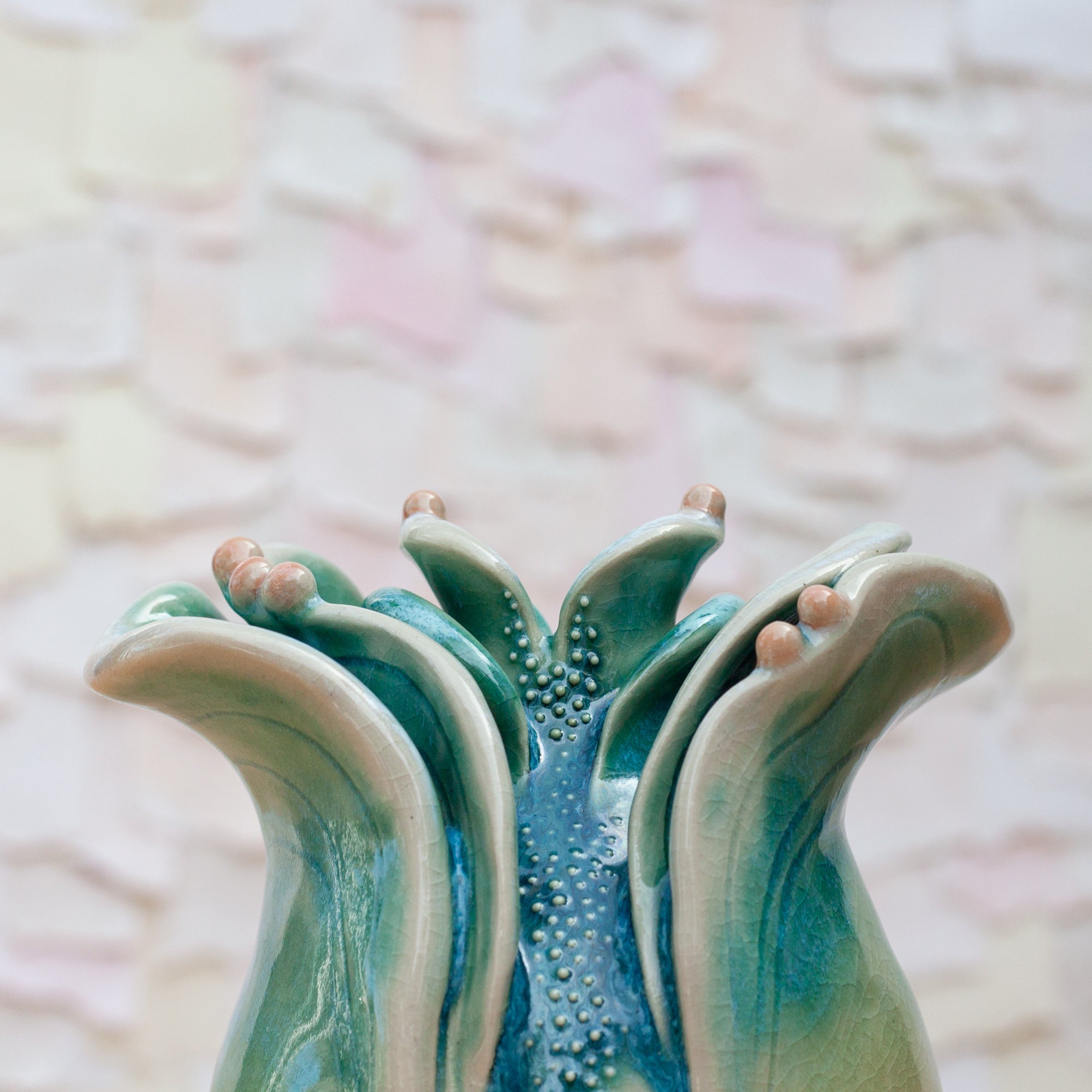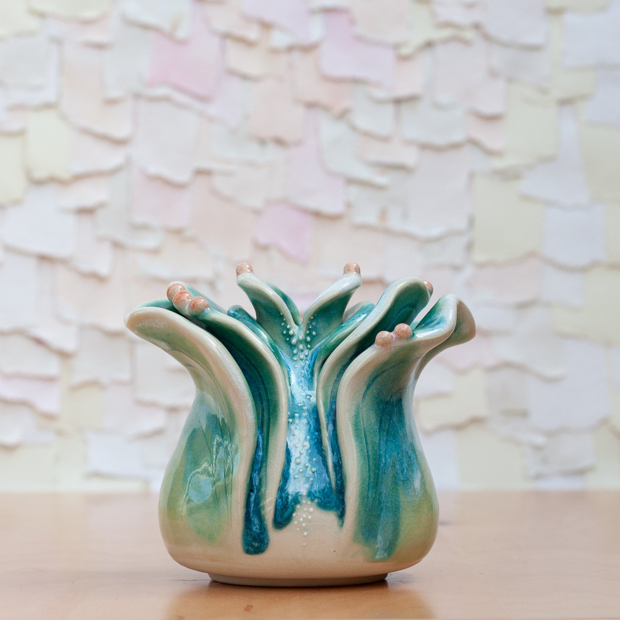 Little bud vases perfect for a single bud. This piece has hand sculpted detail flowing around. Beautiful with a flower or on its own!