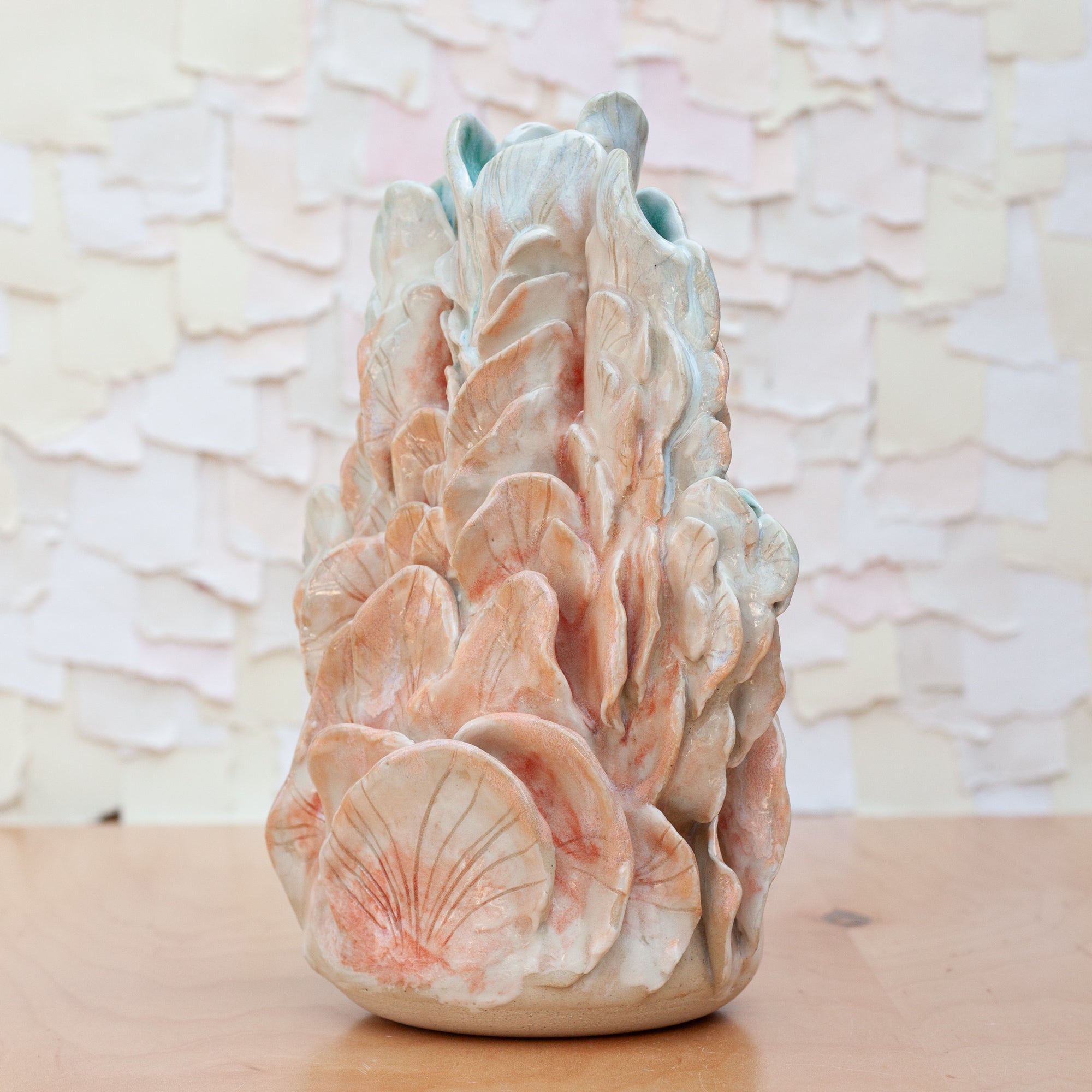 Like a growing reef or a glowing being, this piece was thoughtfully sculpted piece by piece. This stunning piece is a combination of many techniques. Thrown on the wheel, altered and offshoots built to the sides, the texture was then added, layer by layer. A porcelain slip brushed on allows for the glaze to glow.