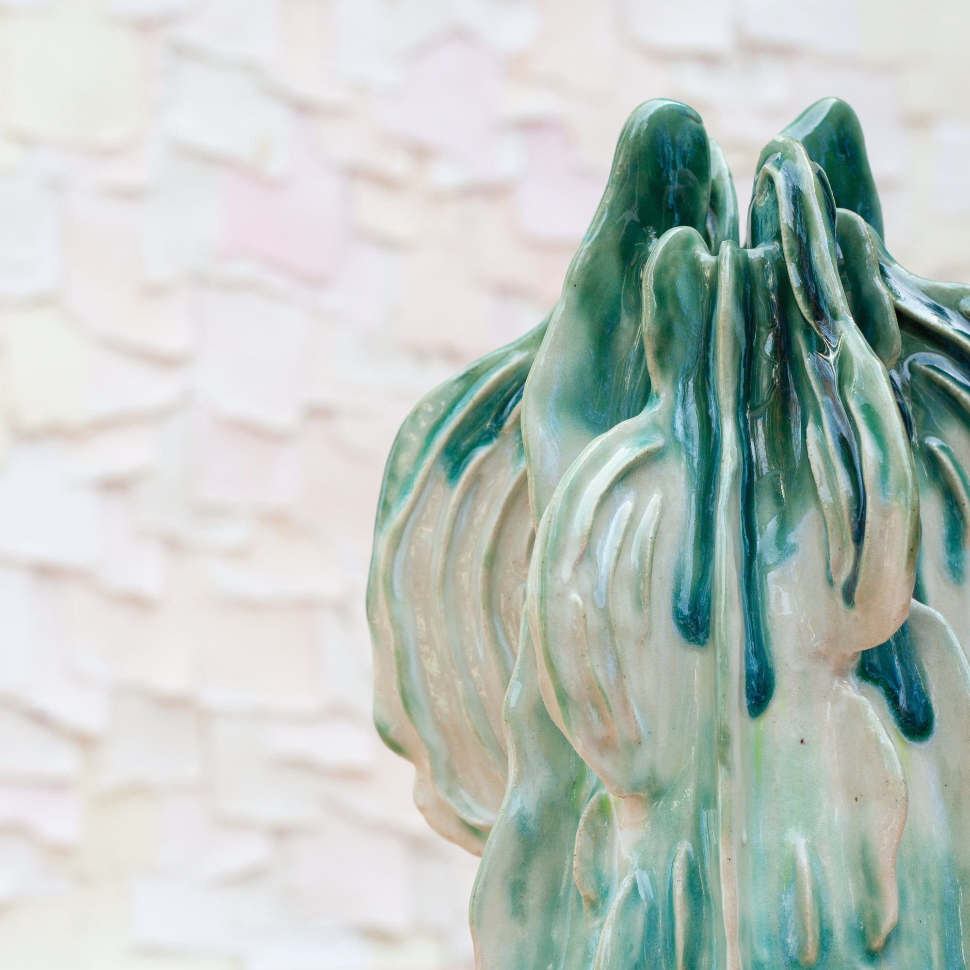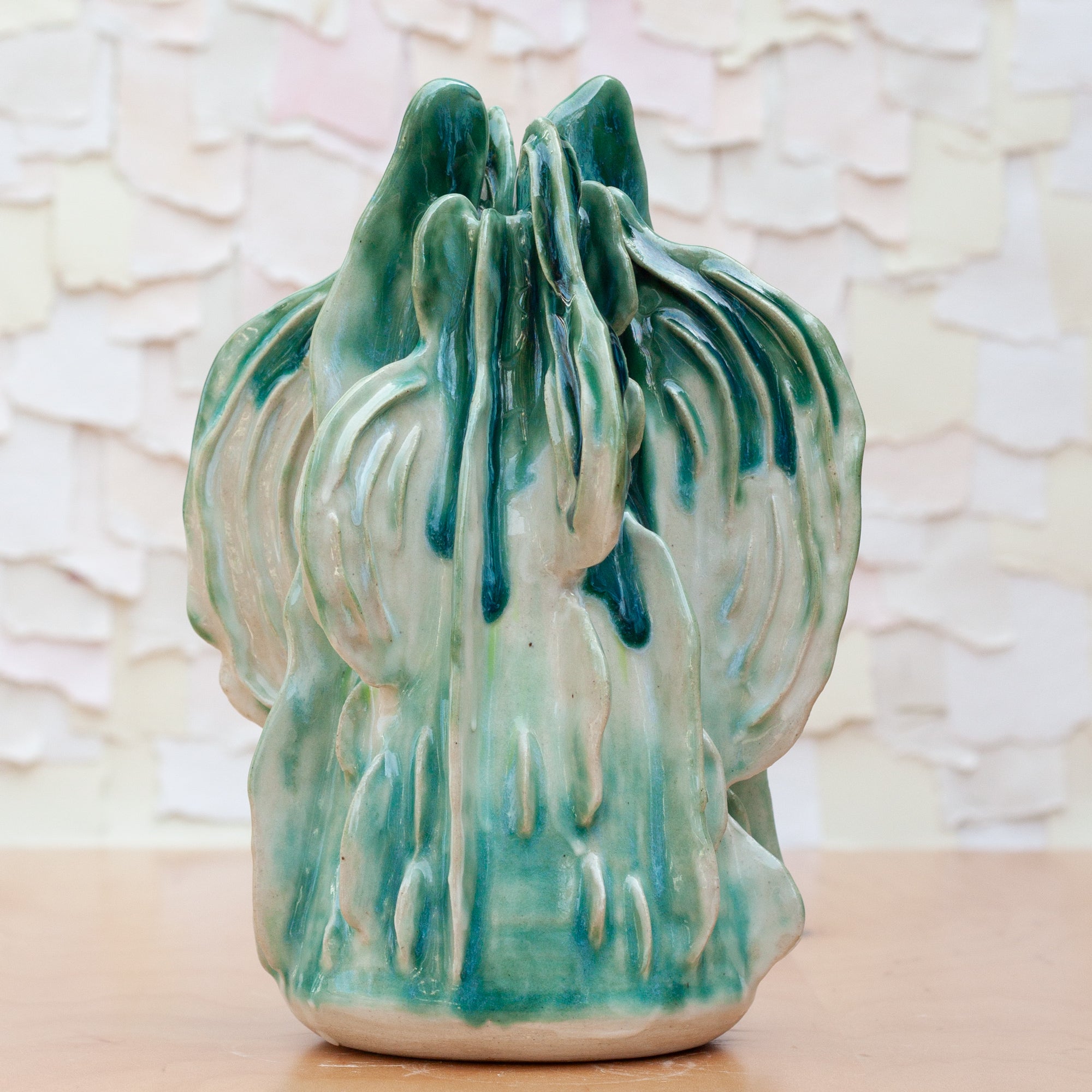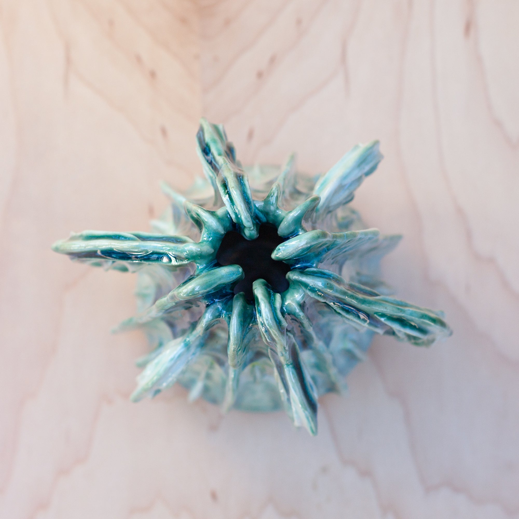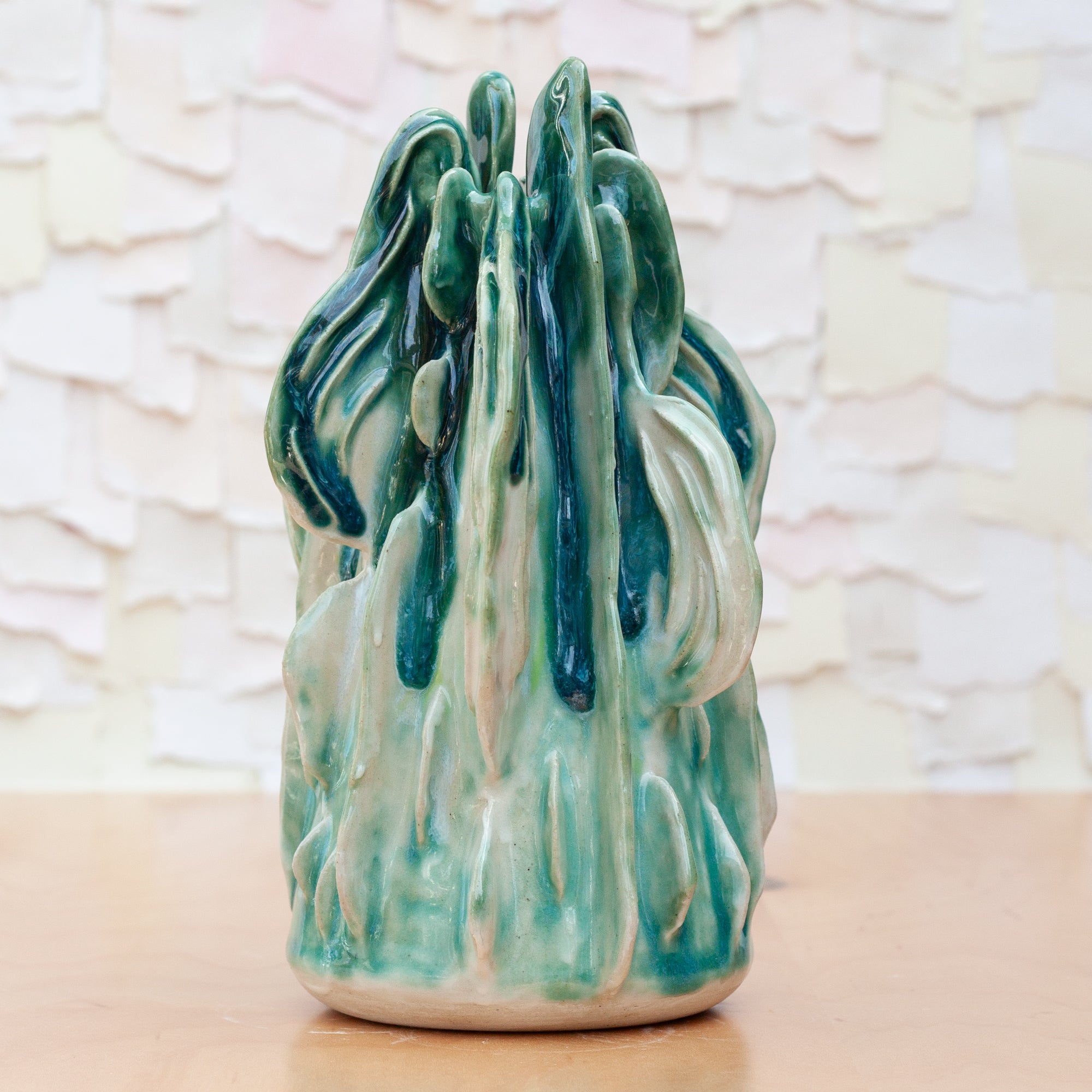 Like a growing reef or a glowing being, this piece was thoughtfully sculpted piece by piece. This stunning piece is a combination of many techniques. Thrown on the wheel, altered and "fins" built to the sides, the texture was then added, layer by layer. A porcelain slip brushed on allows for the glaze to glow.